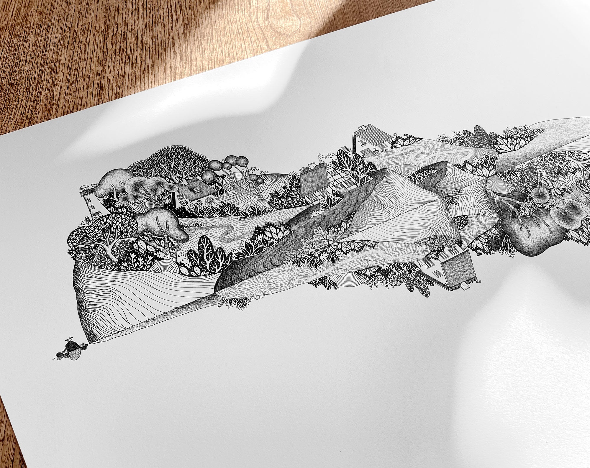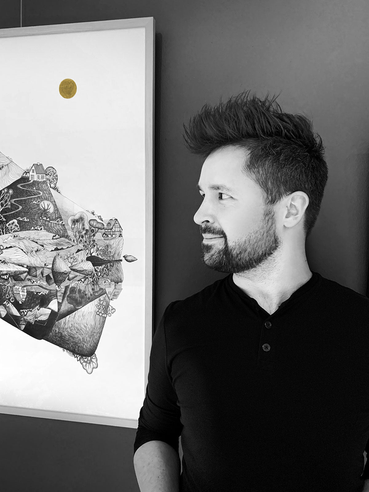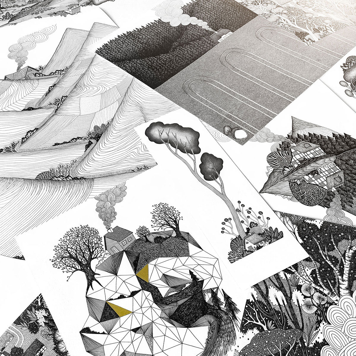 Tegning har altid været en stor del af mit liv. Særligt tålmodighed og detaljegrad fascinerer mig, og det er ofte tanken om det endelige resultat, der motiverer mig i mit arbejde – at arbejde på de mindste detaljer, for så at gå på afstand og betragte helheden. Jeg arbejder også som selvstændig sangskriver og producer, og min hverdag er fyldt med melodier, ord og lyde, der kontinuerligt cirkulerer i mine tanker. Når jeg tegner kan jeg lægge de tanker i baggrunden, og kan på den måde give plads til en pause og en indre ro. En ro, som afspejler sig i mine motiver, ofte af hytter og huse, omgivet af forskellig natur.
