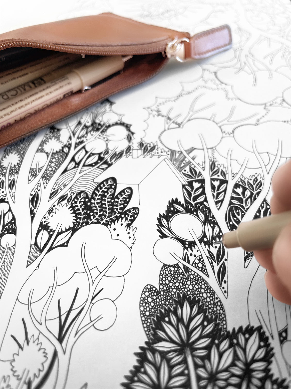 Originale værker håndtegnet med sort 0,05 fiberpen.