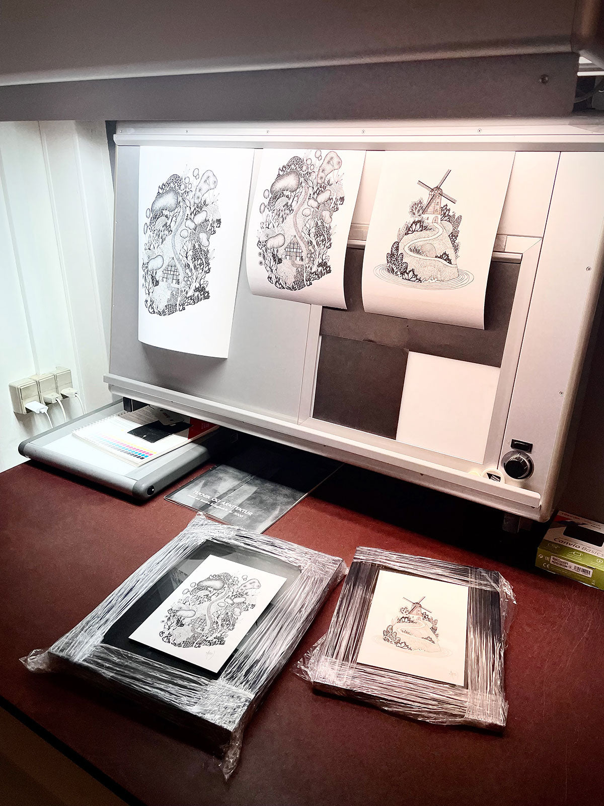 Giclée er et kunsttryk skabt ved hjælp af en specialiseret højopløsnings inkjetprinter. Et giclée print skiller sig ud med sit ekstremt høje niveau af kvalitet, levetid og værdi sammenlignet med et standardprint. Alle mine printillustrationer er højopløseligt scannede og lysjusteret, så alle detaljer i mine originale tegninger bevares. De begrænsede oplag af giclée print er trykt på et 190 g. akvarelpapir af høj kvalitet.
